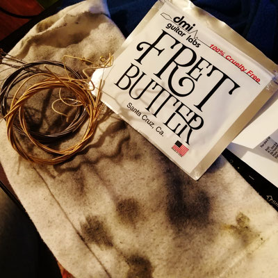 初めて「FRET BUTTER」というものを使ってみました。これは今まで指板とフレットは分けて磨いてたんですが、一気にできますよ~ってな商品です。。